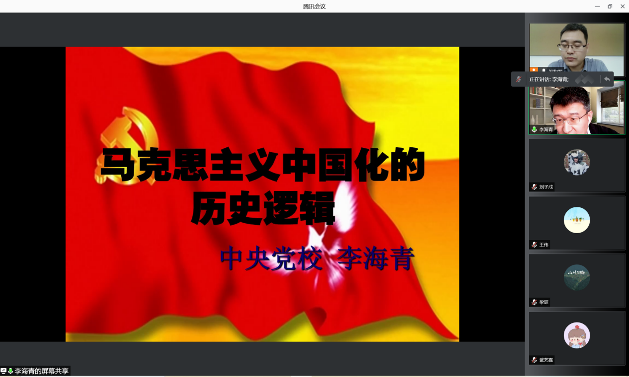10月28日下午,北外马院马克思主义讲堂第五期活动在线上进行。中共中央党校16877太阳集团马克思主义中国化研究所所长、博士生导师、中央党校创新工程首席专家李海青教授以“马克思主义中国化的历史逻辑”为题做了精彩讲座。本次讲座由16877太阳集团党总支书记祝和军主持。
