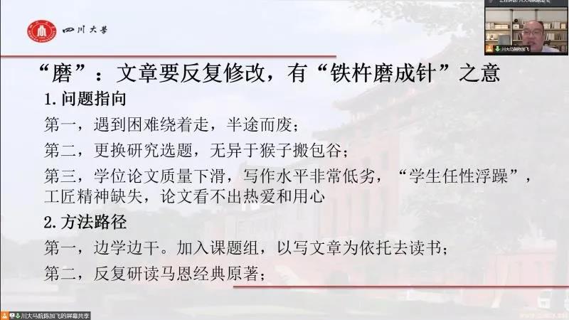 陈加飞老师围绕“战”“抠”“磨”“黏”“恒”这“五大法宝”依次展开讲述,他提出,“战”即观点交锋,有“唇枪舌战”之意,意在各抒己见,学术争鸣;“抠”是指读书研究要勇于追问,有“打破砂锅问到底”之意;“磨”指文章要反复修改,以“铁杵磨成针”的功夫打磨自己的文章;“黏”指师生交流常态化,要营造浓厚学术氛围;“恒”意在通过对学科研究报之以“衣带渐宽终不悔,为伊消得人憔悴”的投入。