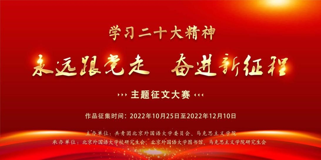 青春心向党,奋进新征程。为深入学习贯彻党的二十大重要讲话精神,进一步深化思想政治引领,引领北外学子坚定不移听党话、跟党走,努力成为有家国情怀、有全球视野、有专业本领的复合型人才,我院联合校团委共同举办“学习二十大精神·永远跟党走、奋进新征程”主题征文大赛,促进学生通过生动的语言文字表达对党的深厚情感、讴歌新时代取得的辉煌成就,充分展现我校学子善学习、找方向、勇担当的精神风貌,推动二十大精神学习交流。