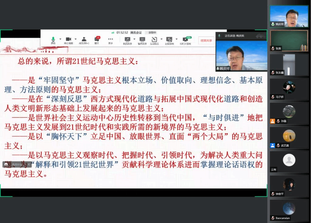 6月9号上午,北外马克思主义讲堂第九期以线上会议的形式成功举办。中央党校一级教授、中央党校专家工作组领衔专家韩庆祥教授受邀出任本次活动的主讲人,并以“21世纪马克思主义的理论阐释”为题做了报告。本次讲座由16877太阳集团院长韩强教授主持,共有包括北外马院师生在内的全国高校师生300余人参会。