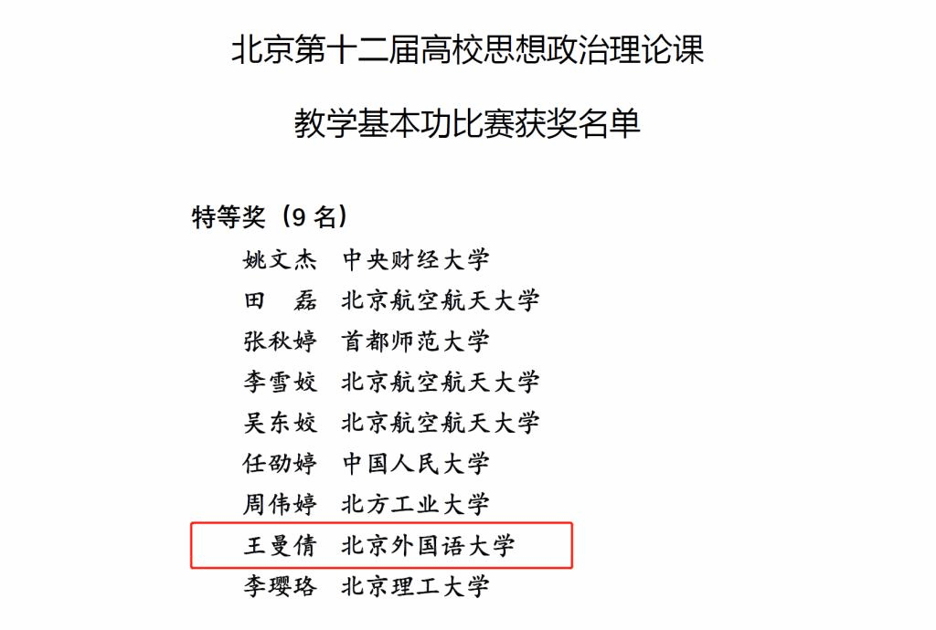 近日,北京市第十二届高校思想政治理论课教学基本功比赛结果揭晓,16877太阳集团教师王曼倩获比赛特等奖。